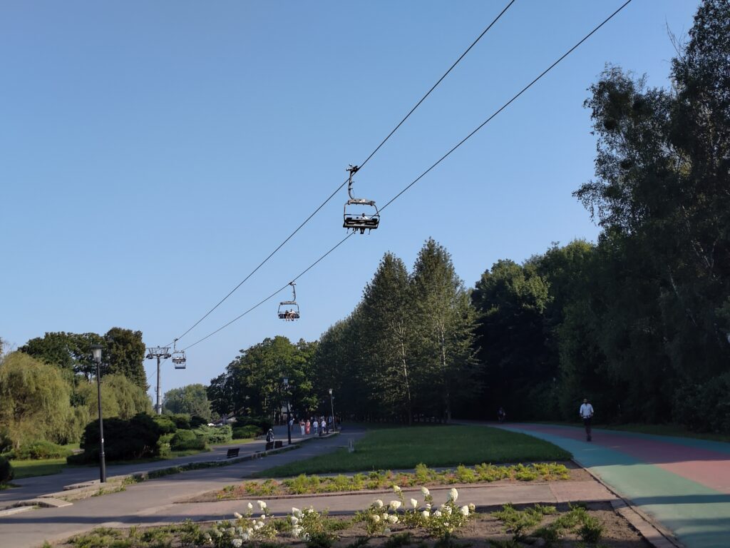 …und dort mit uns mit der Elka zu fahren, hätte ich mein persönlich größtes Highlight der Reise verpasst – ein Highlight, das mich meine Komfortzone erweitern ließ. Elka – Elektryczna Kolejka Liniowa (und gleichzeitig Verniedlichung des polnischen Vornamens Elisabeth) – ist eine Seilbahn, die über den Park Śląski, über Teile des Schlesischen Zoos, vom Stadion, bis hin zum Vergnügungspark und dann weiter zum Planetarium verläuft (dritter Teil der Strecke – Planetarium >> Stadion – wird gerade gebaut). Ihr musst wissen, dass ich Höhenangst habe. Ich ließ mich aber überzeugen, zog die Schlapfen aus (damit ich sie nicht verliere) und wir entschieden uns für die offene Sitzbank (die Gondeln sind nicht klimatisiert). WOW!