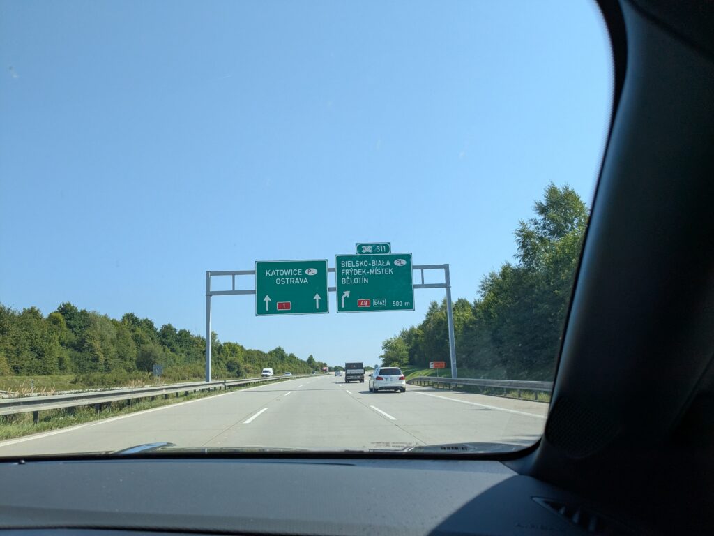 Wir sind am Donnerstag, den 14.08.2025, um halb acht in der Früh am Wiener Hauptbahnhof und holen beim Sixt unser Mietauto ab. Erst zu diesem Zeitpunkt können wir die e-Vignette für die tschechischen Autobahnen kaufen (wir brauchen ja das Kennzeichnen). Plant dafür genug Zeit ein, denn es kann Stunden dauern, bis die tschechische e-Vignette aktiv wird! Fast die gesamte Strecke Wien-Katowice fahren wir auf Autobahnen. Das polnische Stück ist (Stand August 2025) kostenlos.