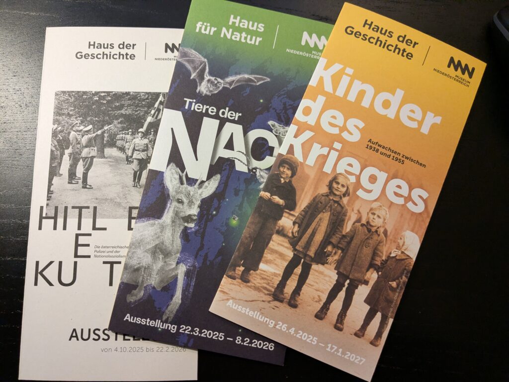 Mit der NÖ-Card ist auch der Eintritt ins Museum Niederösterreich kostenlos (auch mit dem Vorzeigen der Girokarte einer bestimmten Bank ist der Eintritt an diesem Tag gratis) und beinhaltet drei Ausstellungen: „Kinder des Krieges“ (die bis 17. Jänner 2027 läuft) sowie „Hitlers Executive“ (bis 22. Februar 2026) im Haus der Geschichte und „Tiere der Nacht“ (bis 8. Februar 2026) in Haus für Natur.
