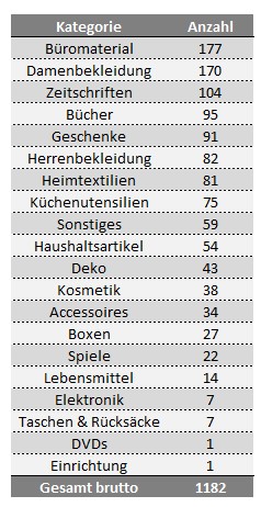 Dass Zeitschriften und Damenbekleidung (Socken ;-)!) zu den am meisten aussortierten gehören werden, damit habe ich gerechnet. Das Endergebnis nach Kategorie hat mich aber doch überrascht: