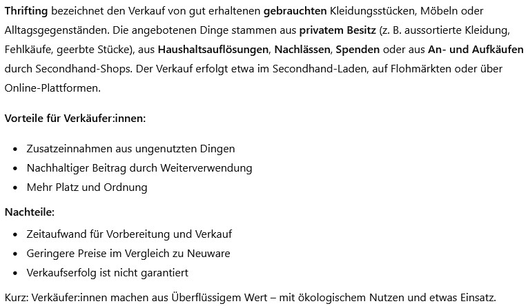 * Ich habe ChatGPT um eine Definition von thrifting (aus der Sicht der Verkäufer:innen) gebeten, hier ist, was er mir darüber erzählte: